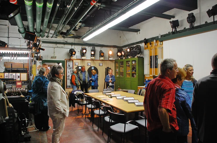 Detlef Hahn, der als Mitarbeiter für Führungen durch das Technische Kabinett zuständig ist, zeigte den ehemaligen Lehrlingen das Kabinett, das heute nur noch zu Ausstellungszwecken verwendet wird. Es beinhaltet die größte Sammlung historischer Beleuchtungstechnik in Deutschland. Darunter befinden sich alte Scheinwerfer, Beleuchtungsrequisiten und andere technische Geräte. Die ehemaligen Auszubildenden freuten sich über das Wiedersehen – sowohl mit alten Kolleginnen und Kollegen als auch mit bekannten technischen Gegenständen aus ihrer Ausbildungszeit.