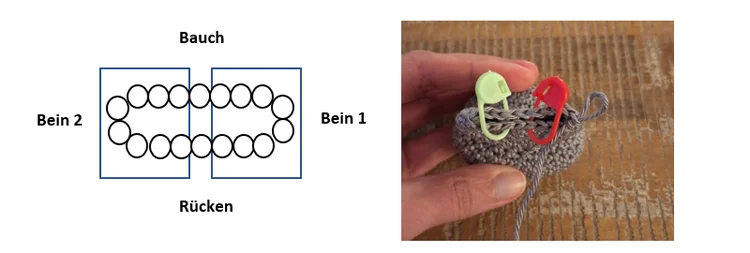 8 M (Bein 2) – 1 M oben/1 M unten als Zwischenraum – 8 M (Bein 1)