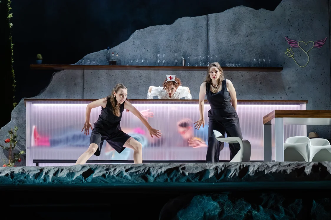 Fiordiligi, Dorabella, Ferrando, Guglielmo – vier Personen sind reif für die Insel; sie sehnen sich nach Urlaub und Abenteuer. Paare finden sich, die Insel-Idylle scheint perfekt, aber vielleicht haben die Strippenzieher Alfonso und Despina alles nur perfekt inszeniert und die paradiesische Fassade hat eine dunkle Kehrseite? Den Wellen der Liebe folgen Veränderungen, die Emotionen überschäumen lassen – und schließlich Ernüchterung, die kalte Dusche. Befinden wir uns auf einer Insel der Seligen? Oder müssen wir zu der Erkenntnis gelangen, dass wir weitaus verführbarer sind, als wir es sein wollen?