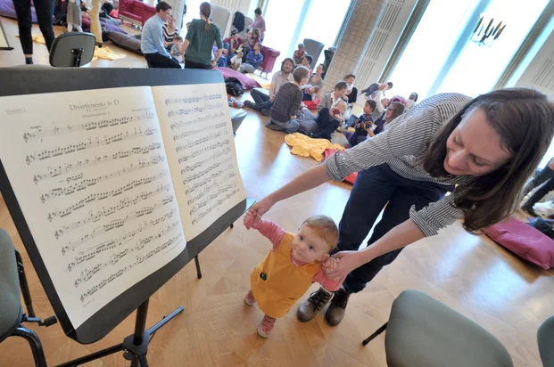 Sanfte Rhythmen, weiche Töne und harmonische Melodien erfüllen den Raum. Vertraute Wiegenlieder und die Raumgestaltung, die es den Babys erlaubt den Musizierenden ganz nah zu sein, schaffen einen Moment der Nähe, des Staunens und gemeinsamen Erlebens.